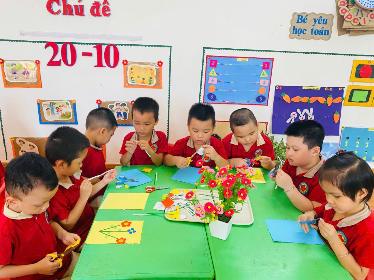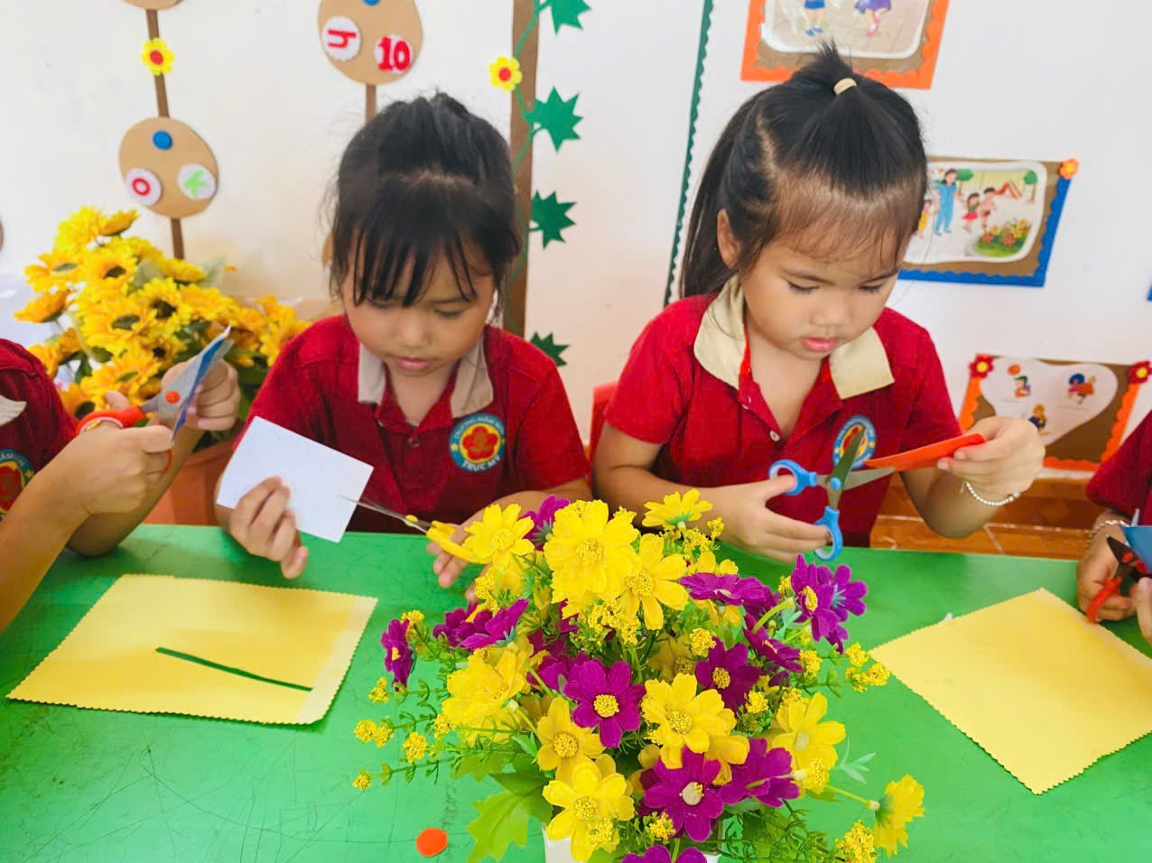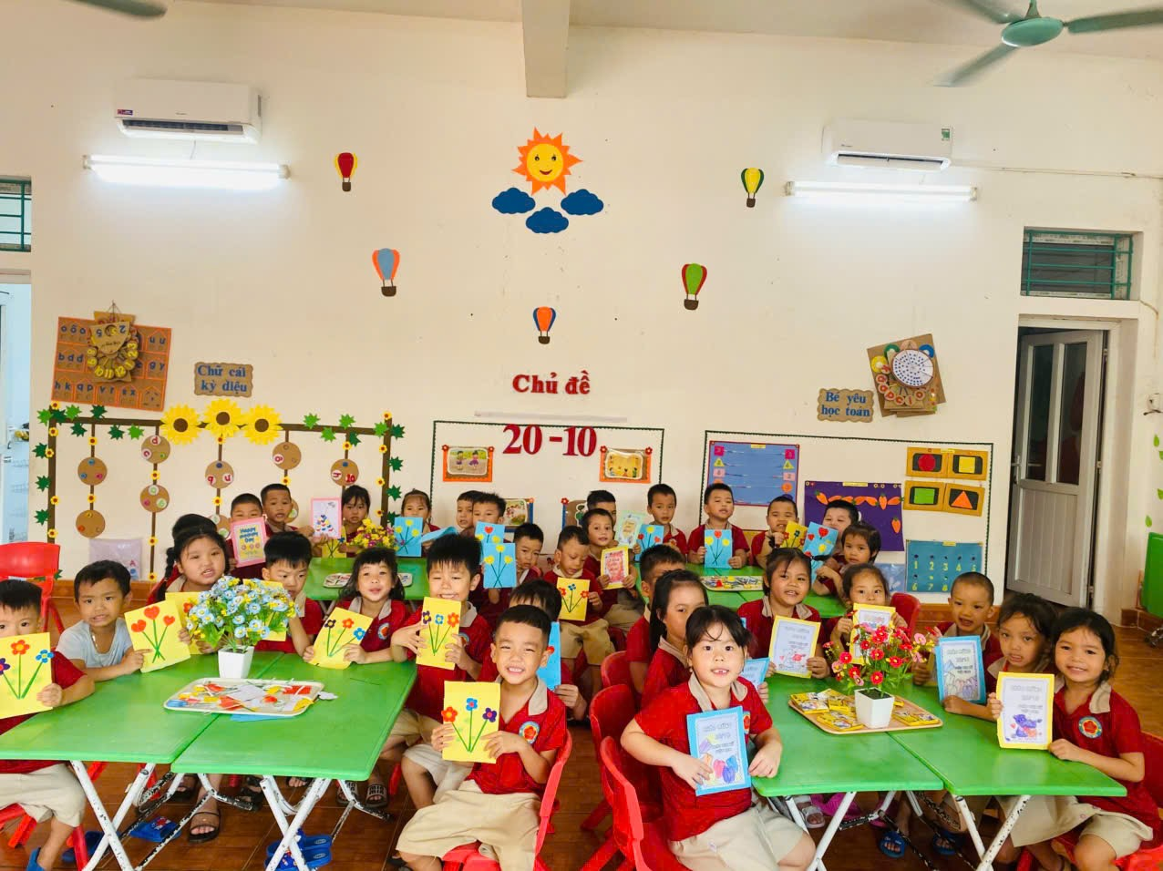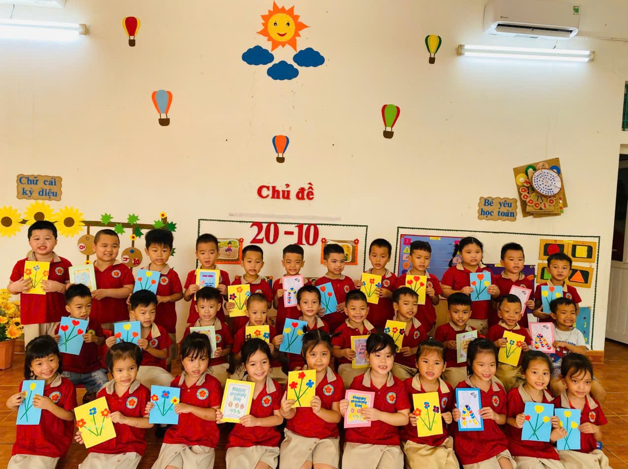 Được sự gợi ý, hướng dẫn của cô giáo, những bàn tay nhỏ nhắn, xinh xinh tỉ mỉ cắt dán những cánh hoa, những đĩa quả từ giấy màu, hay quấn những bó hoa rực rỡ, rồi cẩn thận, nắn nót viết những lời chúc gửi đến bà, đến mẹ và cô giáo của mình.Thật là một món quà ý nghĩa khi chứa đựng tình cảm của các bé thương gửi đến Bà, mẹ và cô giáo trong ngày 20/10. Bé nào cũng phấn khởi vì cảm thấy mình thật tài năng, mình thật khéo tay, dành thật nhiều tình cảm cho những người phụ nữ yêu thương.