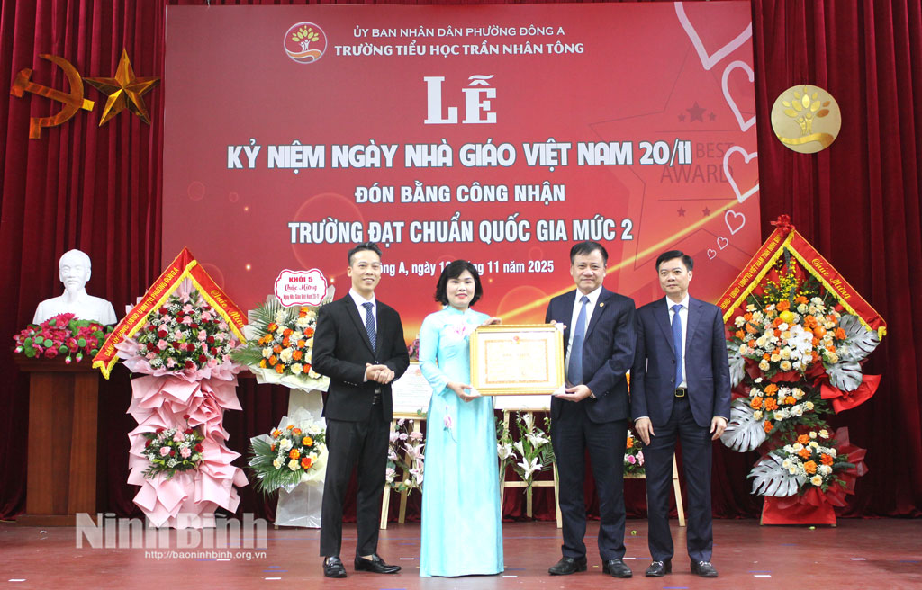 * Cùng ngày, đồng chí Mai Thanh Long, Tỉnh ủy viên, Phó Chủ tịch HĐND tỉnh và các đồng chí Tỉnh ủy viên: Nguyễn Thị Thu Thủy, Phó Bí thư chuyên trách Đảng ủy UBND tỉnh; Nguyễn Xuân Hồng, Bí thư Đảng ủy, Chủ tịch HĐND phường Đông A cùng lãnh đạo các Sở: Khoa học và Công nghệ, Nông nghiệp và Môi trường; UBND phường Đông A đã đến dự, chúc mừng Trường Tiểu học Trần Nhân Tông (phường Đông A) nhân kỷ niệm 43 năm Ngày Nhà giáo Việt Nam 20/11 và đón Bằng công nhận Trường chuẩn quốc gia mức độ II, Kiểm định chất lượng giáo dục mức độ 3; Bằng khen của Chủ tịch UBND tỉnh.