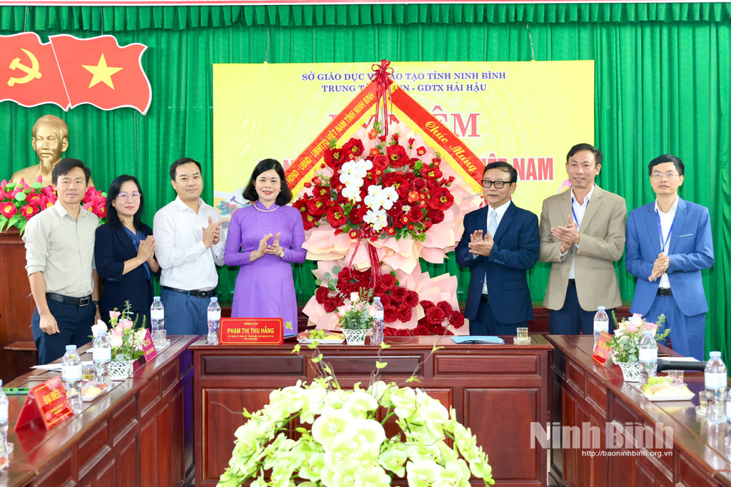 Đồng chí Phạm Thị Thu Hằng, Ủy viên BTV Tỉnh ủy, Tổng Biên tập Báo và phát thanh, truyền hình Ninh Bình tặng hoa chúc mừng thầy, cô giáo Trung tâm GDNN – GDTX Hải Hậu, xã Hải Hưng nhân kỷ niệm 43 năm Ngày Nhà giáo Việt Nam.