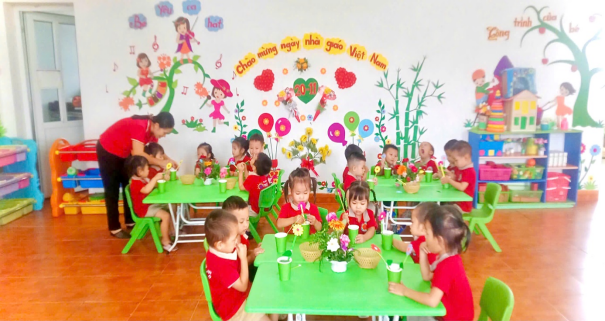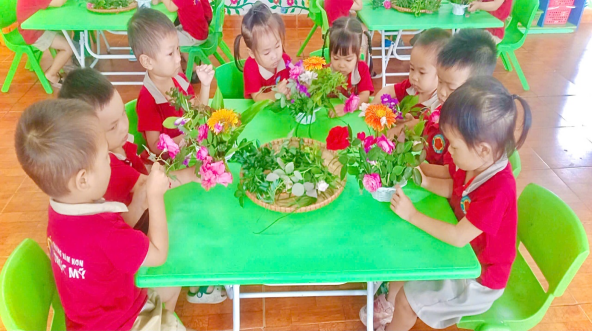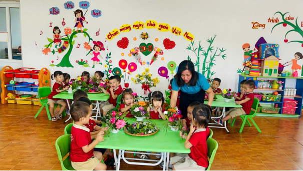 Với hoạt động cắm hoa, các cô giáo chuẩn bị sẵn những nguyên vật liệu như: giỏ cắm hoa ,và các loại hoa tươi, dây ruy băng, lá trang trí, kéo, keo dán… Dưới sự hướng dẫn tận tình của cô, các bé khéo léo cắm từng bông hoa, trang trí giỏ hoa thật sinh động và bắt mắt. Mỗi lẵng hoa là một món quà chan chứa tình cảm, là lời chúc yêu thương gửi tới cô giáo nhân ngày 20/11.