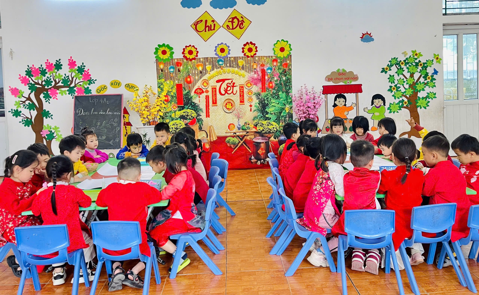 Ngay từ những ngày đầu tháng Chạp, không khí Tết đã len lỏi vào từng góc nhỏ của lớp 4TA1. Dưới sự khéo léo và sáng tạo của các cô giáo cùng sự đóng góp nhiệt tình của các bậc phụ huynh, không gian lớp học bỗng chốc biến hóa thành một không gian đậm chất Xuân.