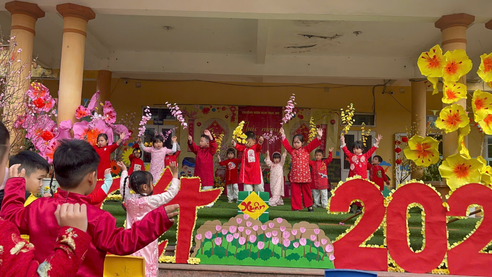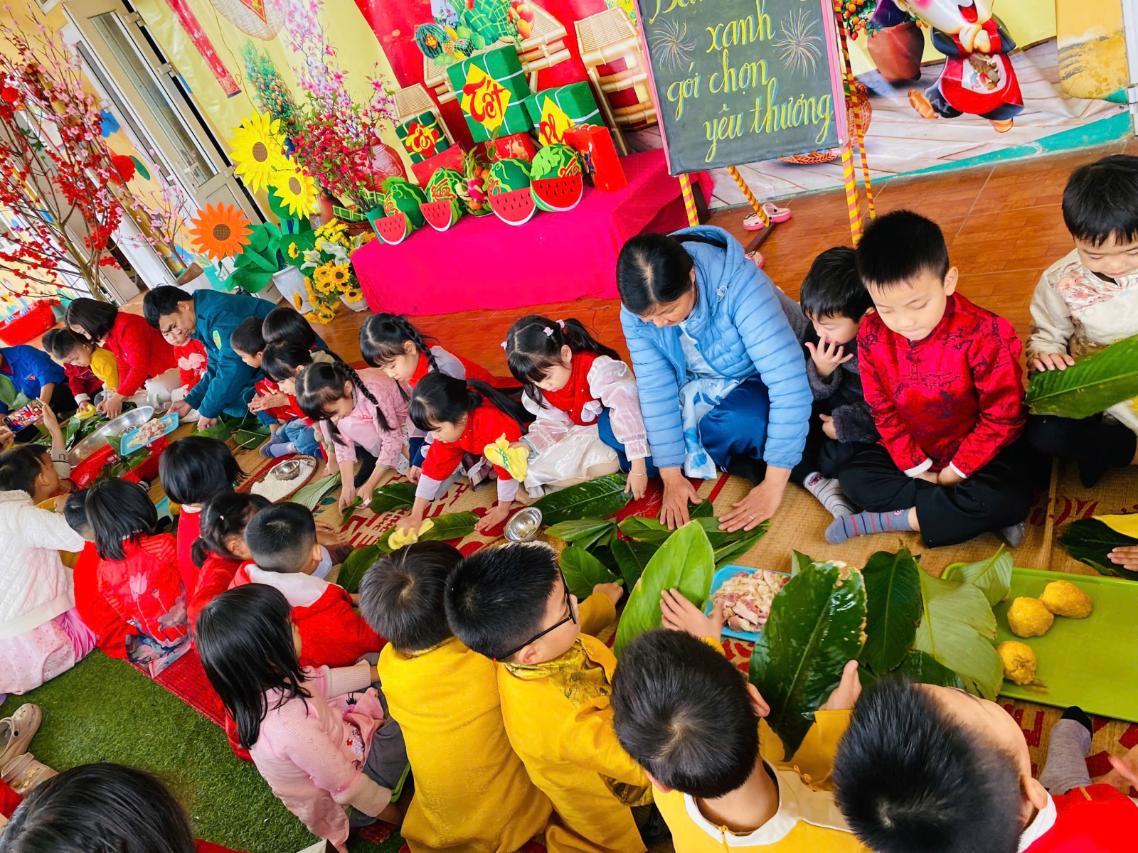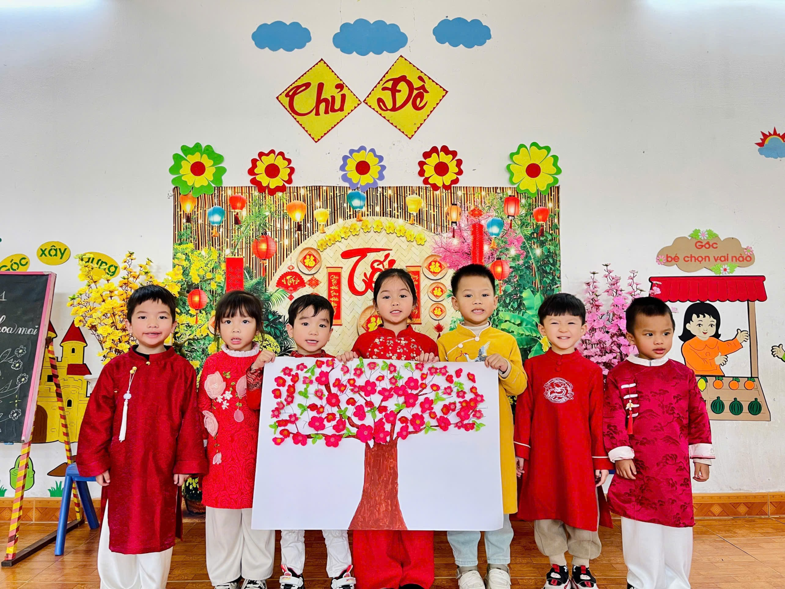 Cây đào, cây mai giả được trang trí tỉ mỉ với những cành lộc non xanh mướt, những bông hoa đào phai thắm, hoa mai vàng rực rỡ. Những câu đối đỏ với lời chúc an khang, thịnh vượng được dán trang trọng, cùng với những chiếc đèn lồng đủ màu sắc, tạo nên một không gian lung linh, ấm áp. Đặc biệt, những mâm ngũ quả được các cô và các bé cùng nhau bày biện, với đủ loại trái cây tươi ngon như chuối, bưởi, cam, táo, thanh long, mang ý nghĩa sung túc, đủ đầy cho năm mới.