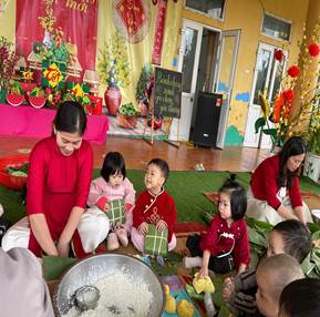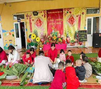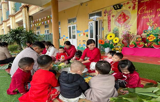 Dưới sự hướng dẫn ân cần của cô Thu và cô Ngát, các bé được làm quen với lá dong, gạo nếp, đậu xanh và cùng cô tham gia gói bánh. Hoạt động giúp trẻ cảm nhận được không khí Tết sum vầy, ấm áp và thêm yêu quý những giá trị truyền thống của dân tộc Việt Nam.