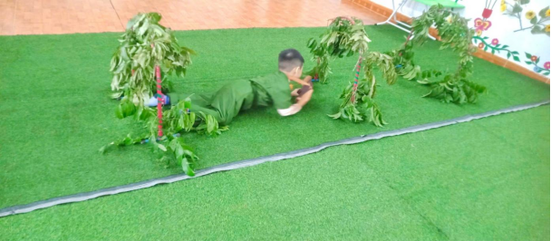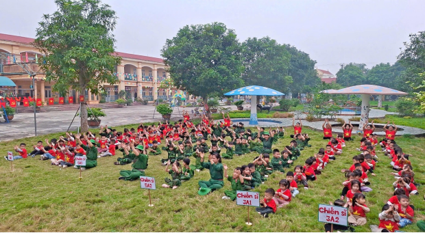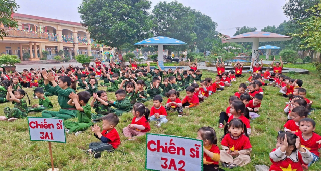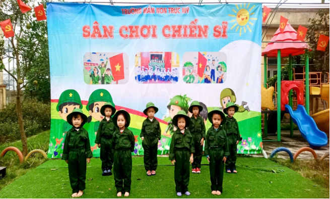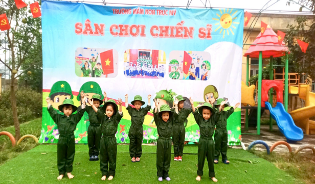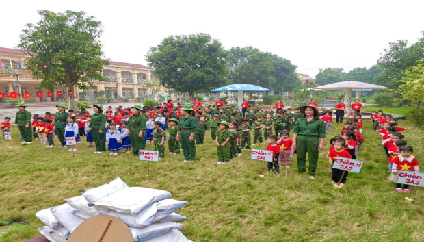 Đặc biệt, hình ảnh các bé trong trang phục màu xanh bộ đội, đội mũ tai bèo, xếp hàng ngay ngắn giữa không gian sân trường đã để lại ấn tượng khó quên. Qua hoạt động hóa thân, các con không chỉ được vui chơi mà còn bước đầu làm quen với hình ảnh người chiến sĩ Quân đội Nhân dân Việt Nam – những con người ngày đêm rèn luyện, sẵn sàng hy sinh để bảo vệ hòa bình, độc lập cho đất nước.