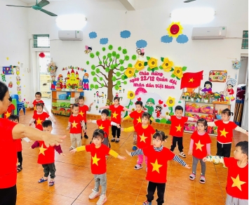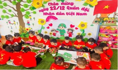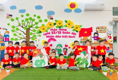 Tại lớp, các cô đã tổ chức các buổi trò chuyện cùng các con về ý nghĩa của ngày 22/12. Các con được tìm hiểu về tên gọi, trang phục, công việc, nơi luyện tập của những người lính… thông qua hoạt động Phát triển nhận thức Khám phá về Ngày 22/12. Từ đó củng cố hiểu biết, kiến thức của trẻ về nghề bộ đội, giúp trẻ hiểu hơn về công việc bảo vệ tổ quốc cũng như trang phục, công việc của các cô chú bộ đội, bồi dưỡng lòng yêu nước, sự biết ơn sâu sắc đối với thế hệ đi trước. Ở hoạt động góc, trẻ tham gia tô tranh, ghép lá cờ Tổ quốc. Các hoạt động không chỉ giúp trẻ nhận biết màu sắc, hình ảnh quen thuộc mà còn rèn luyện kỹ năng cầm bút, ghép hình, phát triển vận động tinh và sự khéo léo của đôi tay. Và trong giờ tập thể dục, trẻ được tham gia các động tác vận động mô phỏng hình ảnh chú bộ đội như hành quân, bước đều theo nhịp. Thông qua hoạt động này, trẻ được rèn luyện thể lực, sự nhanh nhẹn, hình thành thói quen tập thể dục, đồng thời giáo dục trẻ tính kỷ luật, tinh thần tập thể một cách tự nhiên, nhẹ nhàng.