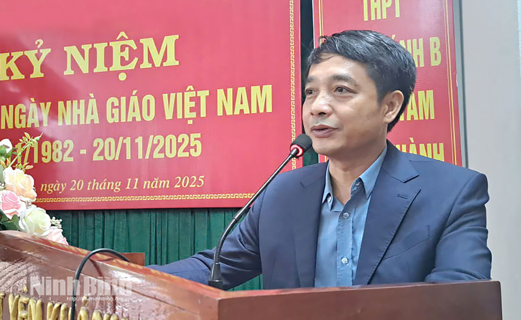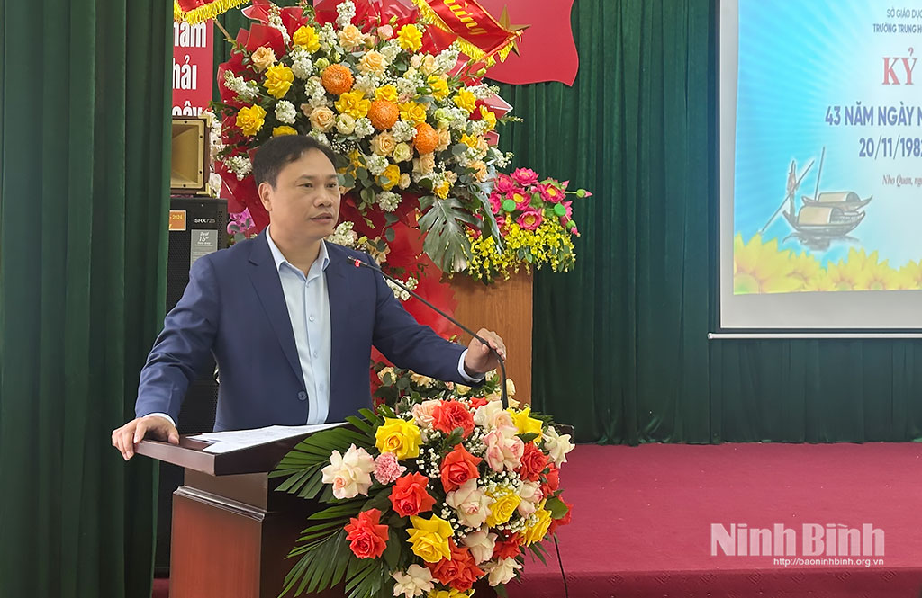 Đồng chí Hoàng Văn Kiên, Tỉnh uỷ viên, Phó Chủ tịch HĐND tỉnh phát biểu chúc mừng nhân Ngày Nhà giáo Việt Nam tại trường THPT Yên Khánh B. Ảnh: Thuỷ Lam