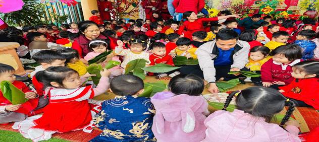 Ngoài ra trẻ còn được tham gia hoạt động trải nghiệm: “Bé vui đón tết” tại trường mầm non diễn ra hai ngày 22 và 23 tháng 12 âm lịch. Trẻ được cùng các cô giáo trải nghiệm gói bánh chưng giúp trẻ bước đầu hiểu quy trình gói bánh, biết quan sát, lắng nghe, hình thành thói quen tham gia hoạt động tập thể và cảm nhận không khí Tết ấm áp, sum vầy.