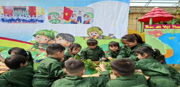 Chuỗi hoạt động được tổ chức với nhiều hình thức phong phú, phù hợp với lứa tuổi mầm non như: Nghe cô giáo kể chuyện về các chú bộ đội, xem tranh ảnh, video tư liệu về Quân đội Nhân dân Việt Nam; tham gia các hoạt động diễu hành, tập làm chú bộ đội, tạo hình vẽ tô chú bộ đội, cùng nhau múa hát những bài hát thiếu nhi ca ngợi hình ảnh anh bộ đội Cụ Hồ. Thông qua các hoạt động này, trẻ được làm quen với hình ảnh người chiến sĩ, hiểu biết sơ giản về nhiệm vụ bảo vệ Tổ quốc và vai trò to lớn của Quân đội Nhân dân Việt Nam. Đặc biệt là các cô đã tổ chức cho các con chương trình trải nghiệm thực tế đã được các bé tham gia nhiệt tình, hứng thú.