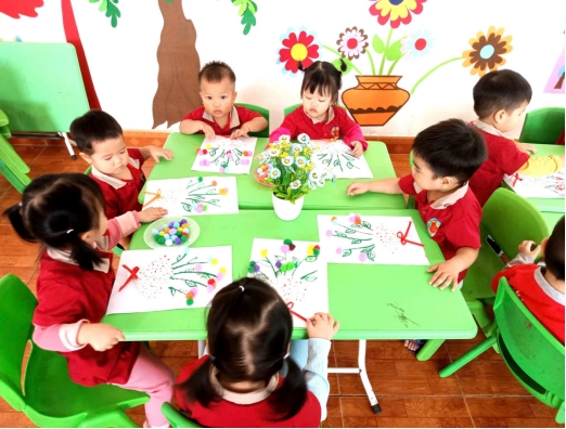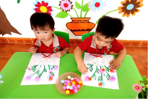 Hoạt động in hoa, gắn quả bông thành những bông hoa giúp trẻ khám phá màu sắc và rèn luyện sự khéo léo. Bé được nhúng màu rồi in lên giấy, lấy quả bông gắn vào giấy, tạo nên những bức tranh đáng yêu, rực rỡ.