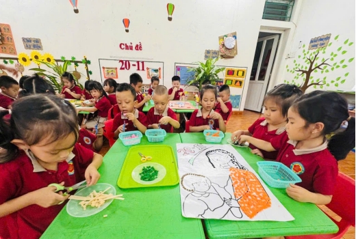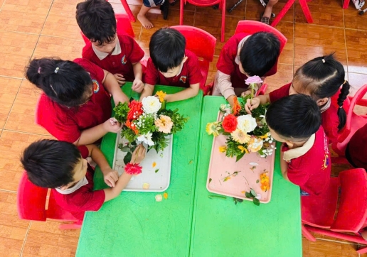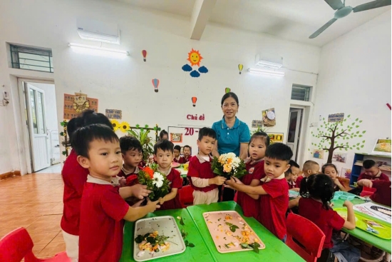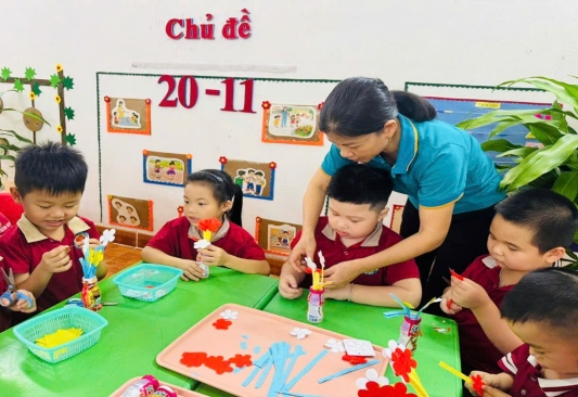 Được sự gợi ý, hướng dẫn của cô giáo, những bàn tay nhỏ nhắn, xinh xinh tỉ mỉ cắt dán những cánh hoa, những đĩa quả từ giấy màu, hay quấn những bó hoa rực rỡ, rồi cẩn thận, nắn nót viết những lời chúc gửi đến bà, đến mẹ và cô giáo của mình.Thật là một món quà ý nghĩa khi chứa đựng tình cảm của các bé thương gửi đến cô giáo trong ngày 20/11. Bé nào cũng phấn khởi vì cảm thấy mình thật tài năng, mình thật khéo tay, dành thật nhiều tình cảm cho những người phụ nữ yêu thương.
