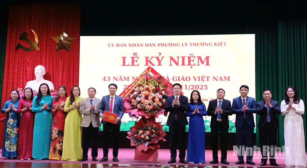 Lãnh đạo Đảng ủy, HĐND, UBND, Ủy ban MTTQ Việt Nam phường Lý Thường Kiệt tặng hoa chúc mừng Ngày Nhà giáo Việt Nam.