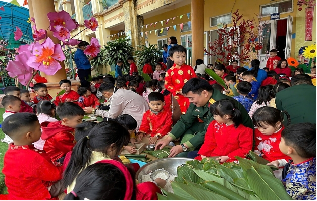 Dưới sự hướng dẫn tận tình của các cô giáo, các đồng chí trong Ban Chỉ huy Quân sự xã và sự hỗ trợ của phụ huynh, các bé được tận mắt quan sát và trực tiếp tham gia các công đoạn gói bánh chưng. Tuy còn nhỏ, bỡ ngỡ, nhưng trên khuôn mặt các con đều ánh lên niềm vui, sự háo hức khi lần đầu tiên được tự tay gói chiếc bánh chưng – biểu tượng thiêng liêng của ngày Tết Việt Nam.