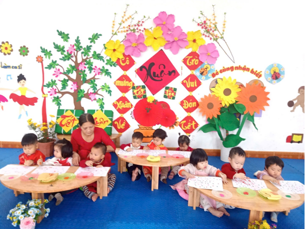 Các lớp đã tổ chức sôi nổi các hoạt động trải nghiệm trong lớp học với nhiều hoạt động ý nghĩa như : Trẻ được tìm hiểu về ngày Tết Nguyên Đán, Trang trí cây mai,cây đào, làm pháo hoa bằng giấy, trang trí thiệp chúc Tết, làm bánh Tết…